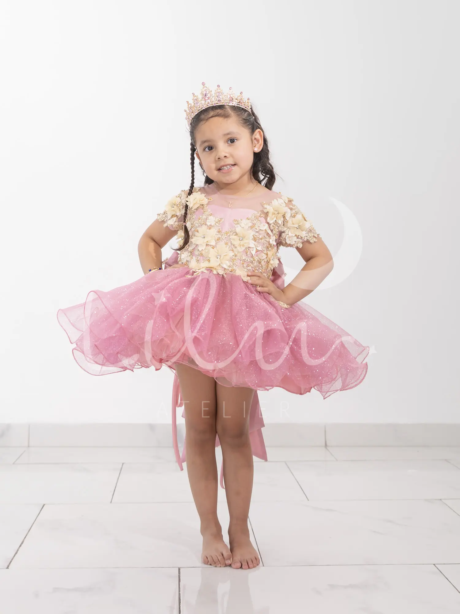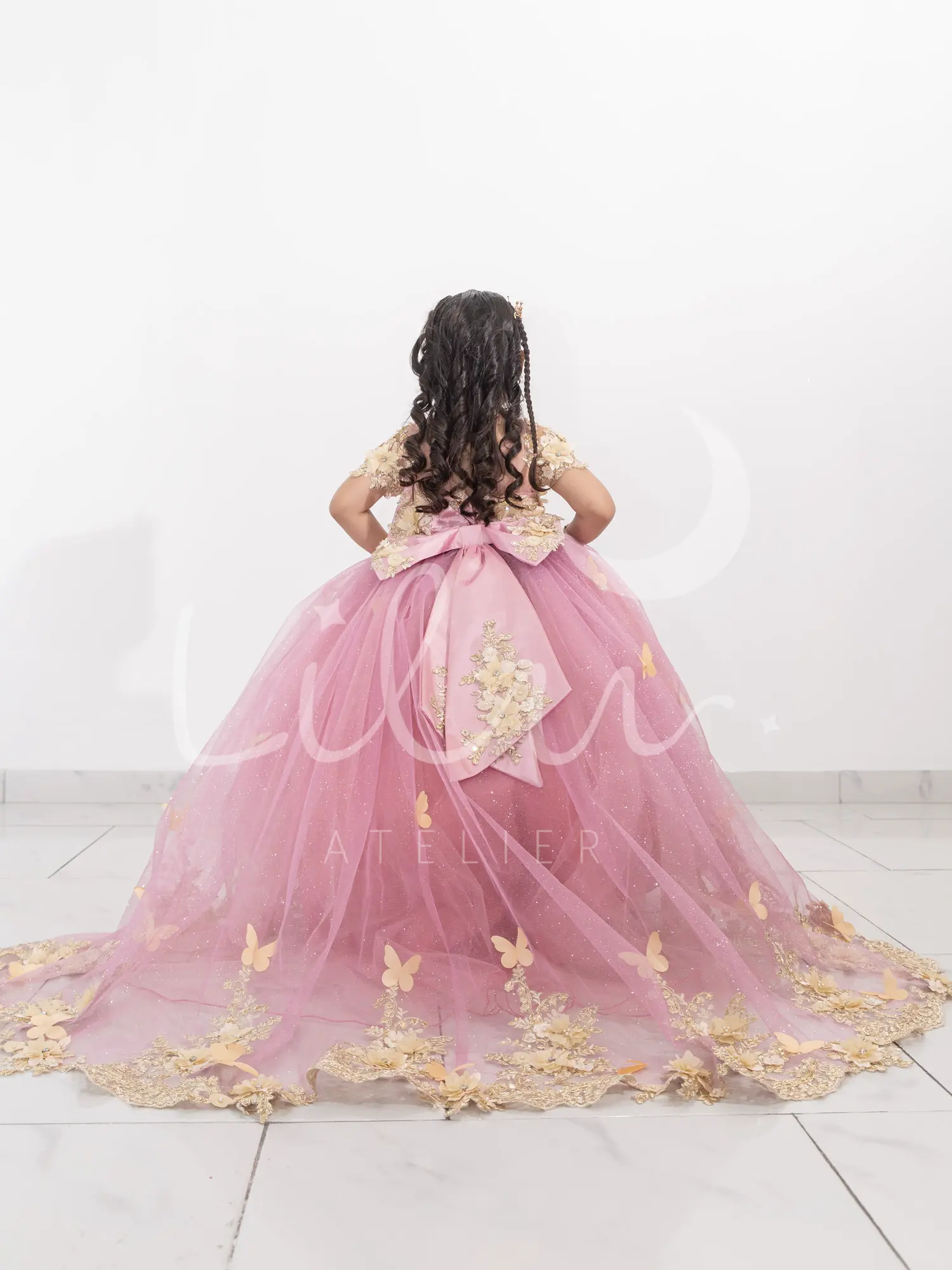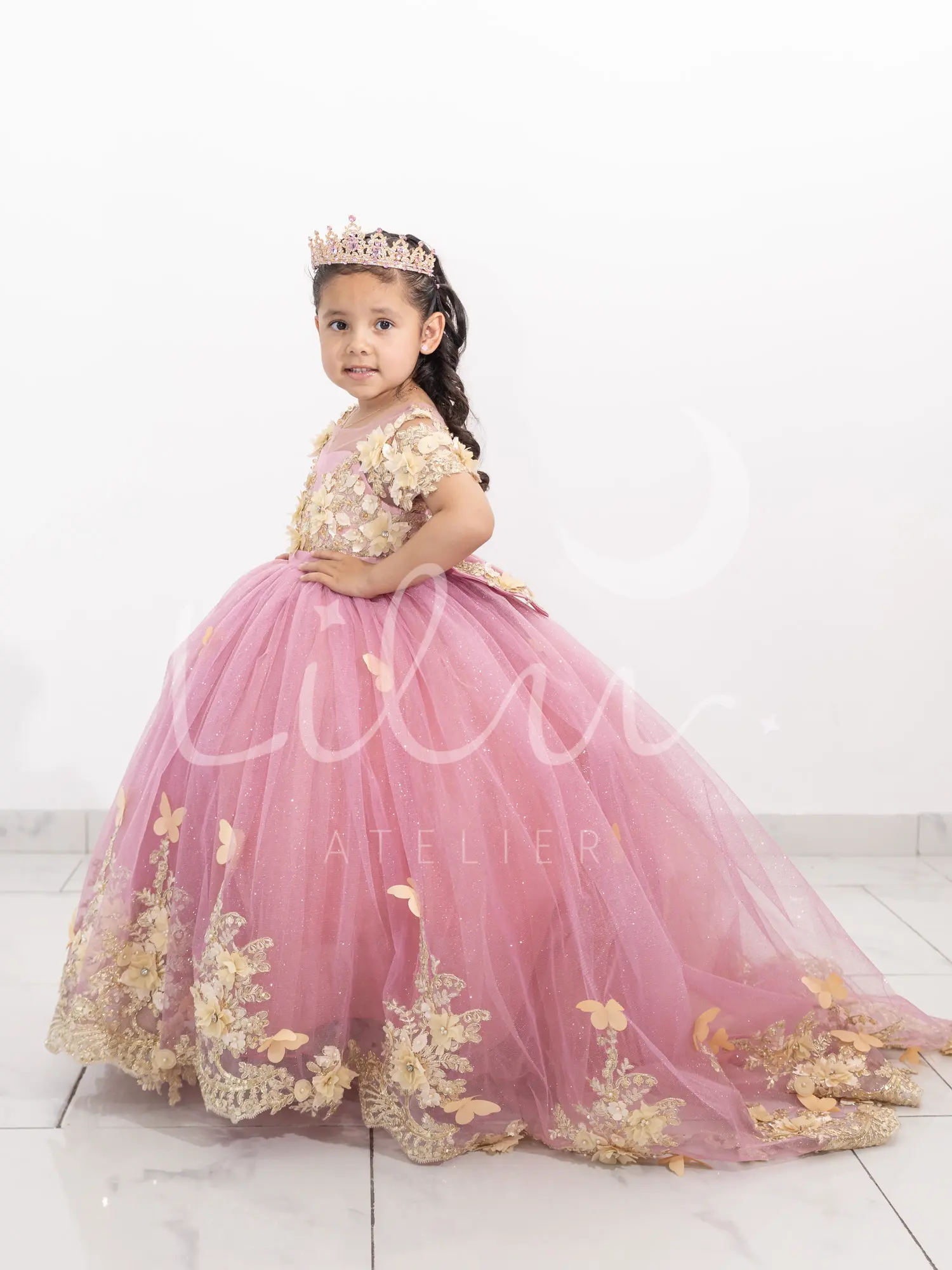 Elegante vestido de presentación desmontable, corset con transparencia en cuello con manga corta, con aplicaciones en 3d con pedrería, talle unido al tutu decorada con mariposas, falda larga desmontable con aplicación en la orilla decorada con mariposas.