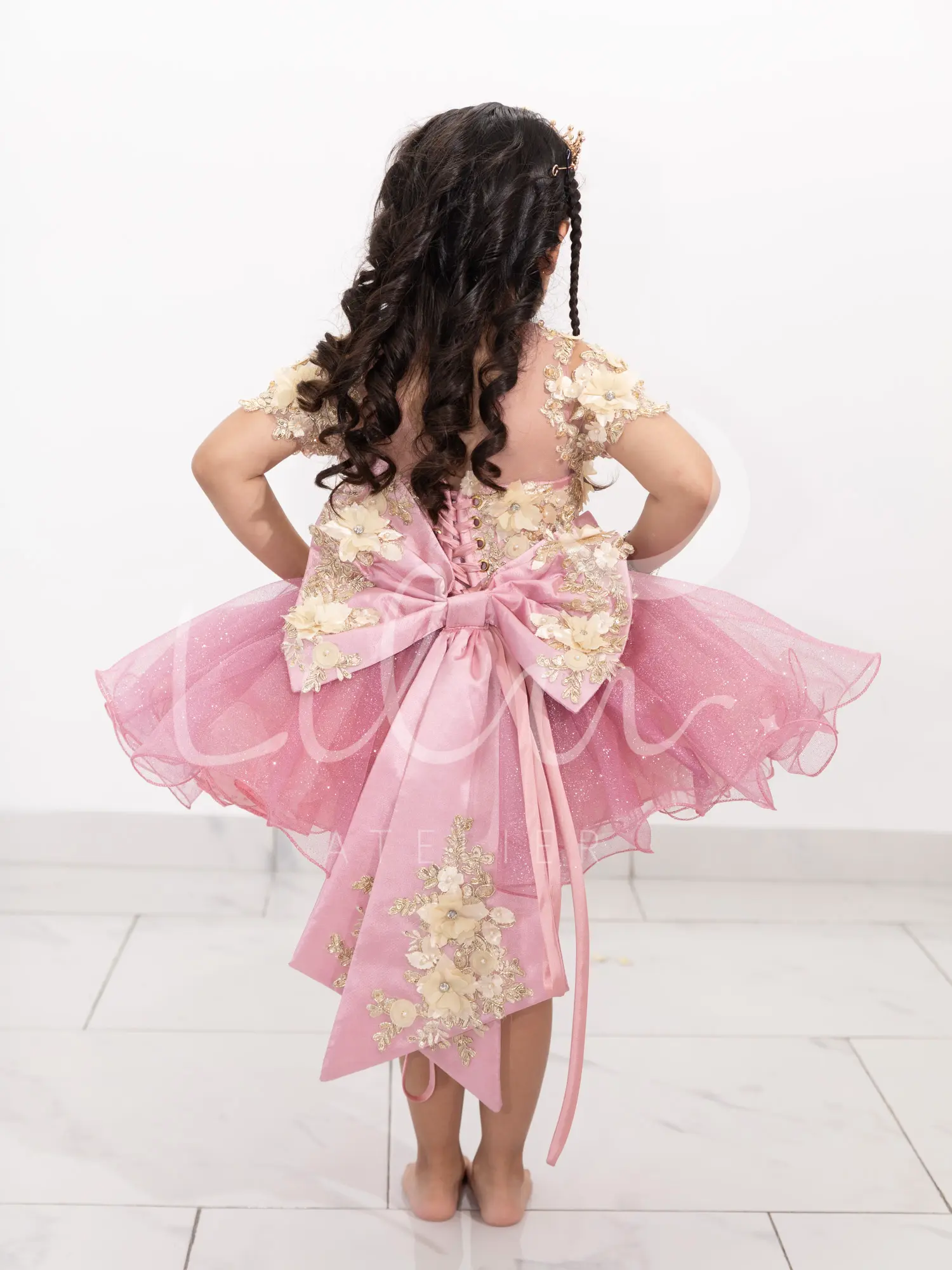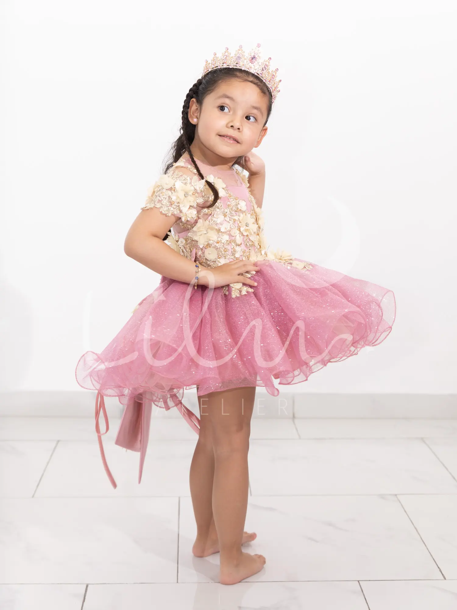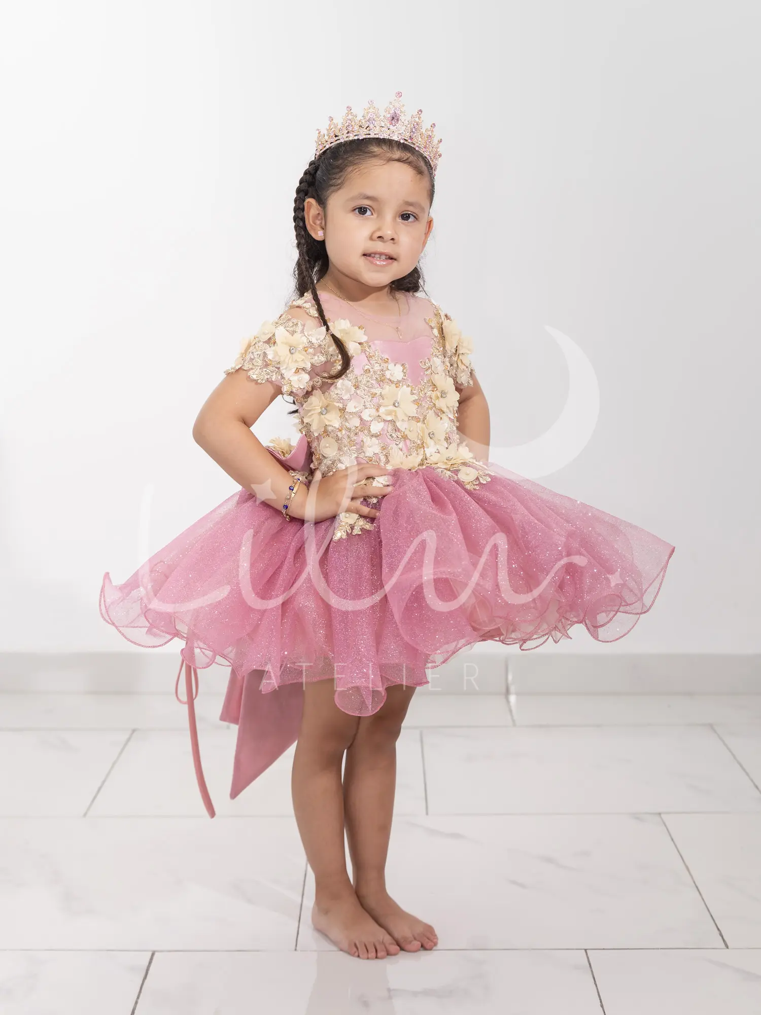 Elegante vestido de presentación desmontable, corset con transparencia en cuello con manga corta, con aplicaciones en 3d con pedrería, talle unido al tutu decorada con mariposas, falda larga desmontable con aplicación en la orilla decorada con mariposas.