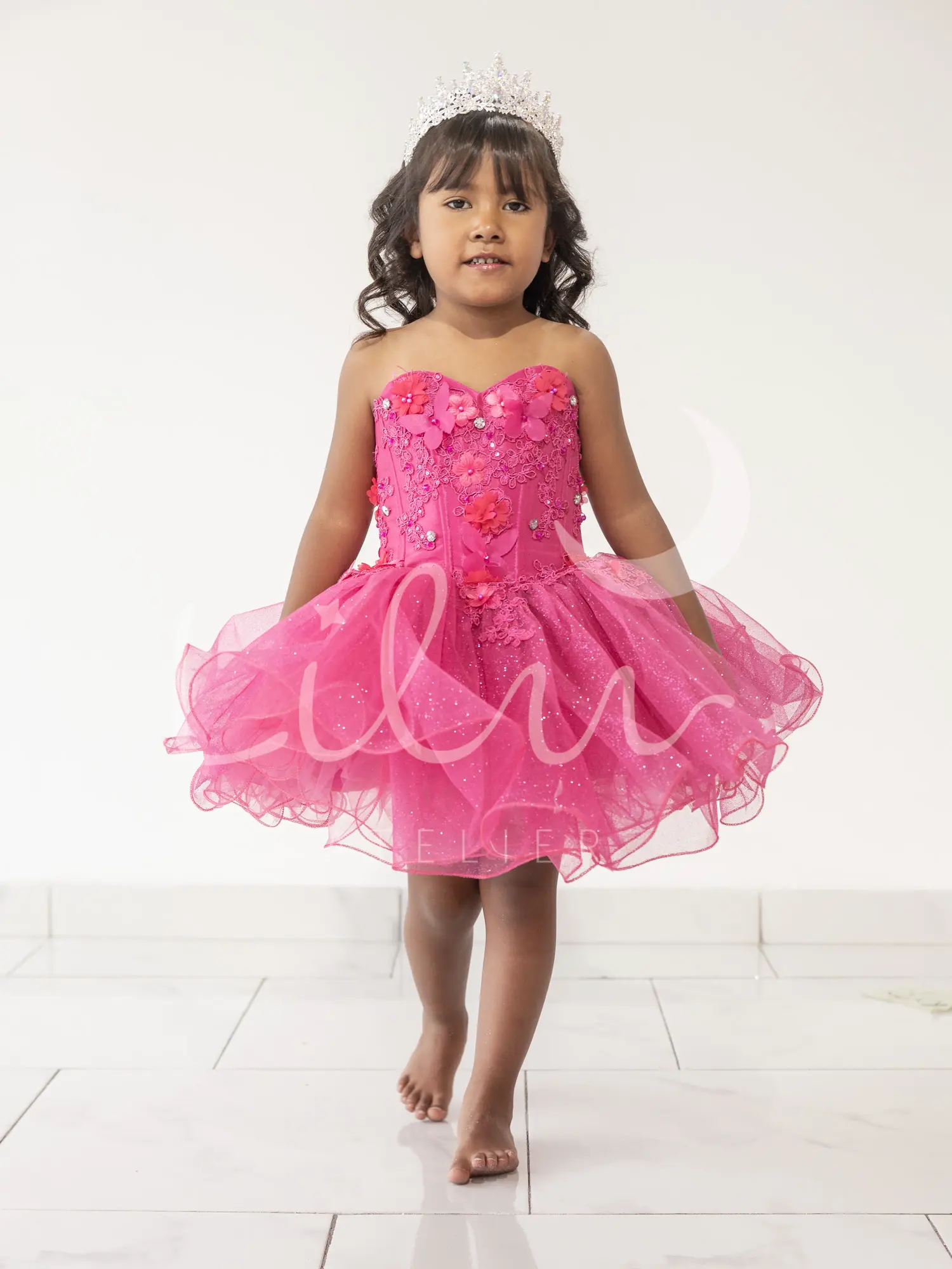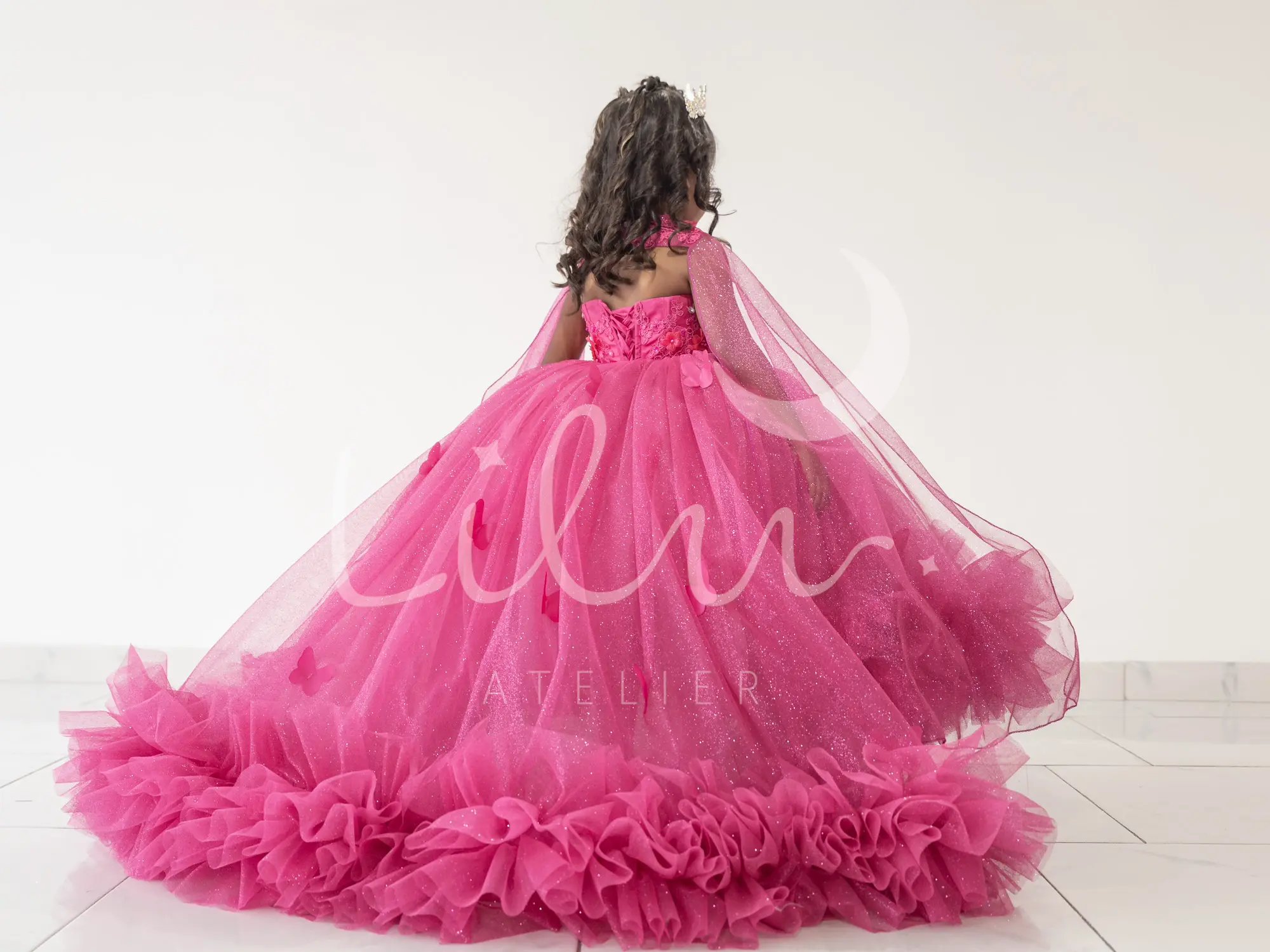 Magnífico vestido de presentación desmontable, talle strapless adornado con aplicación y mariposas en 3d, acompañado de un ensamble con aplicación en hombros, talle unido al tutu, falda larga con pompón decorado con mariposas en 3d.