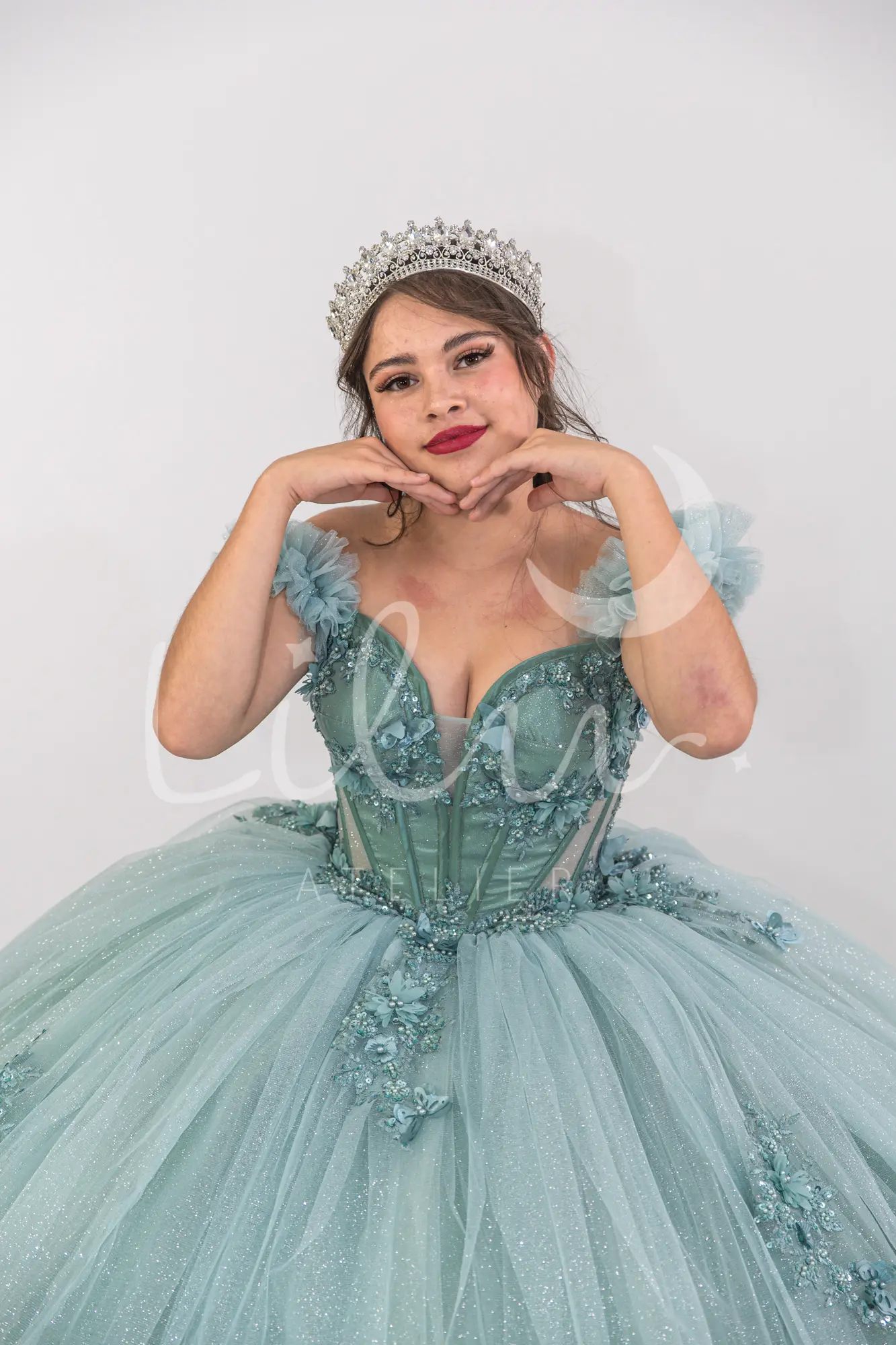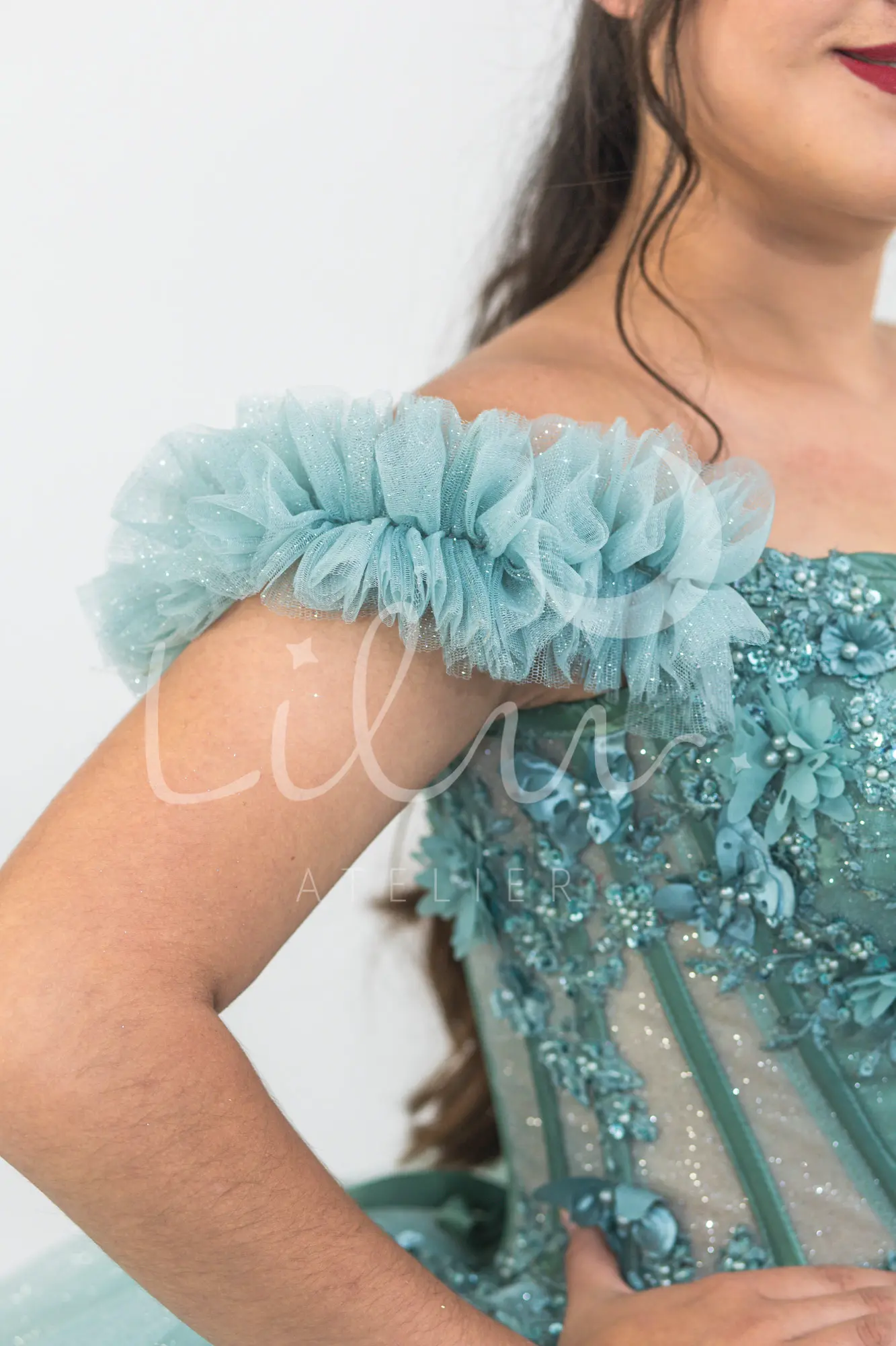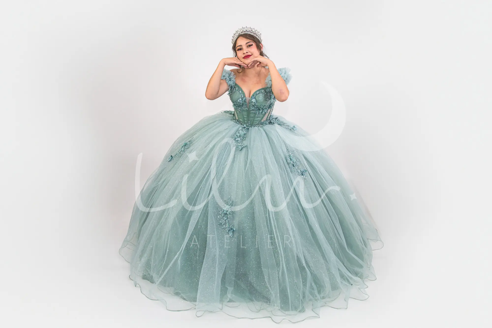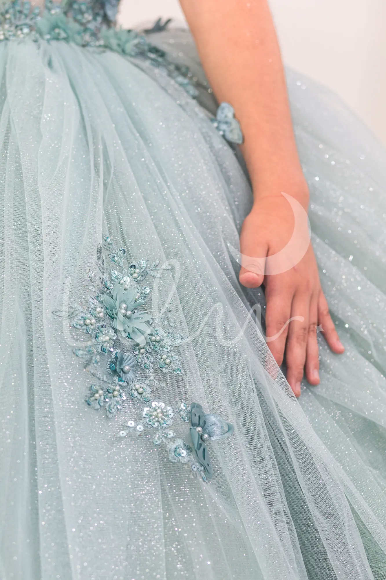 Deslumbrante vestido, corset con transparencia y tul brillante, elaborado con fina aplicación rebordada, flores y mariposas en 3D, con mangas de pompón brillante, falda con coleta realizada en tul brillante con aplicación, para que luzcas espectacular en tu día soñado
