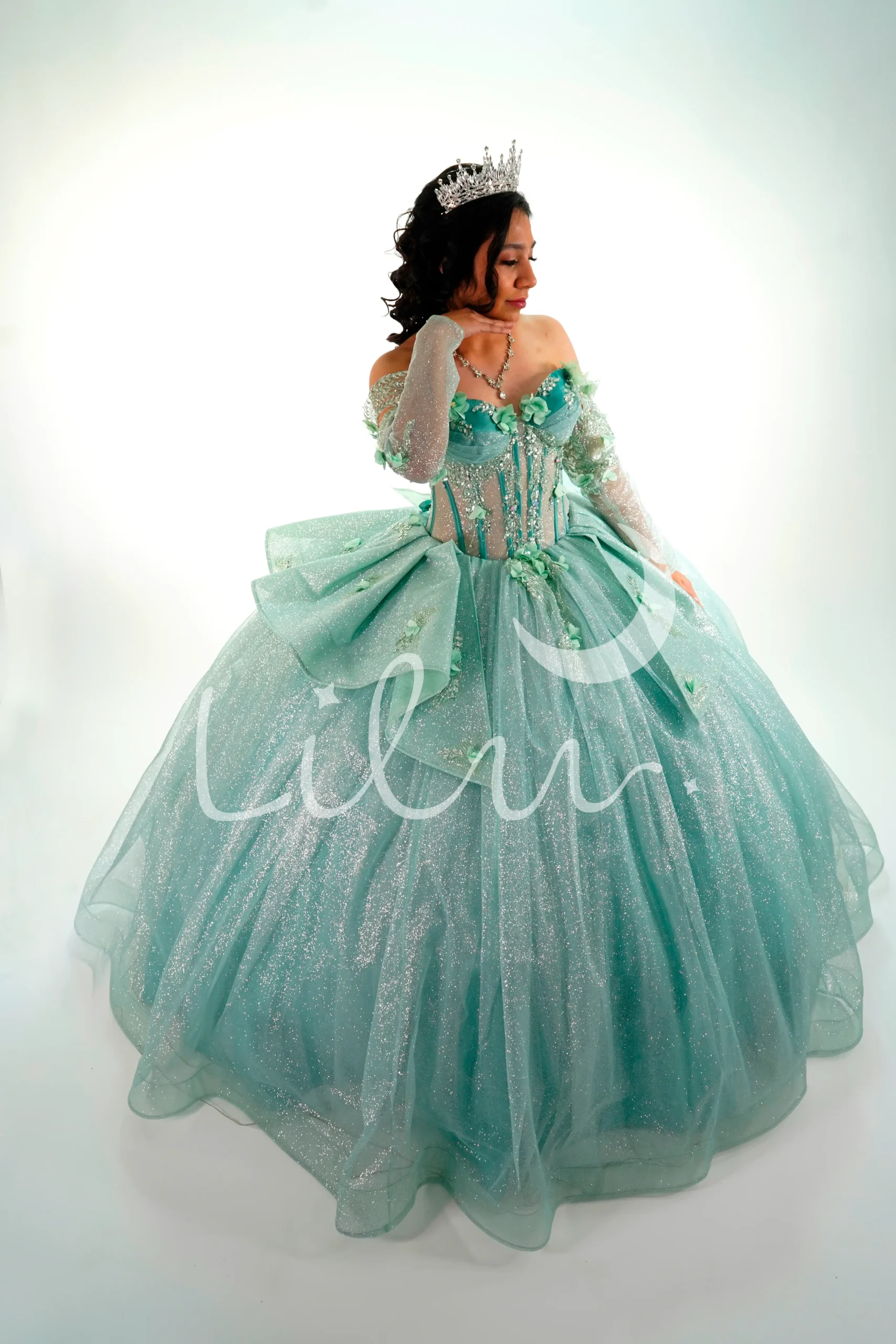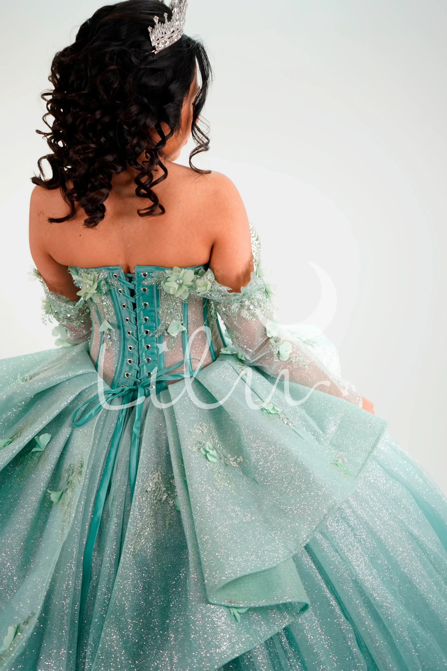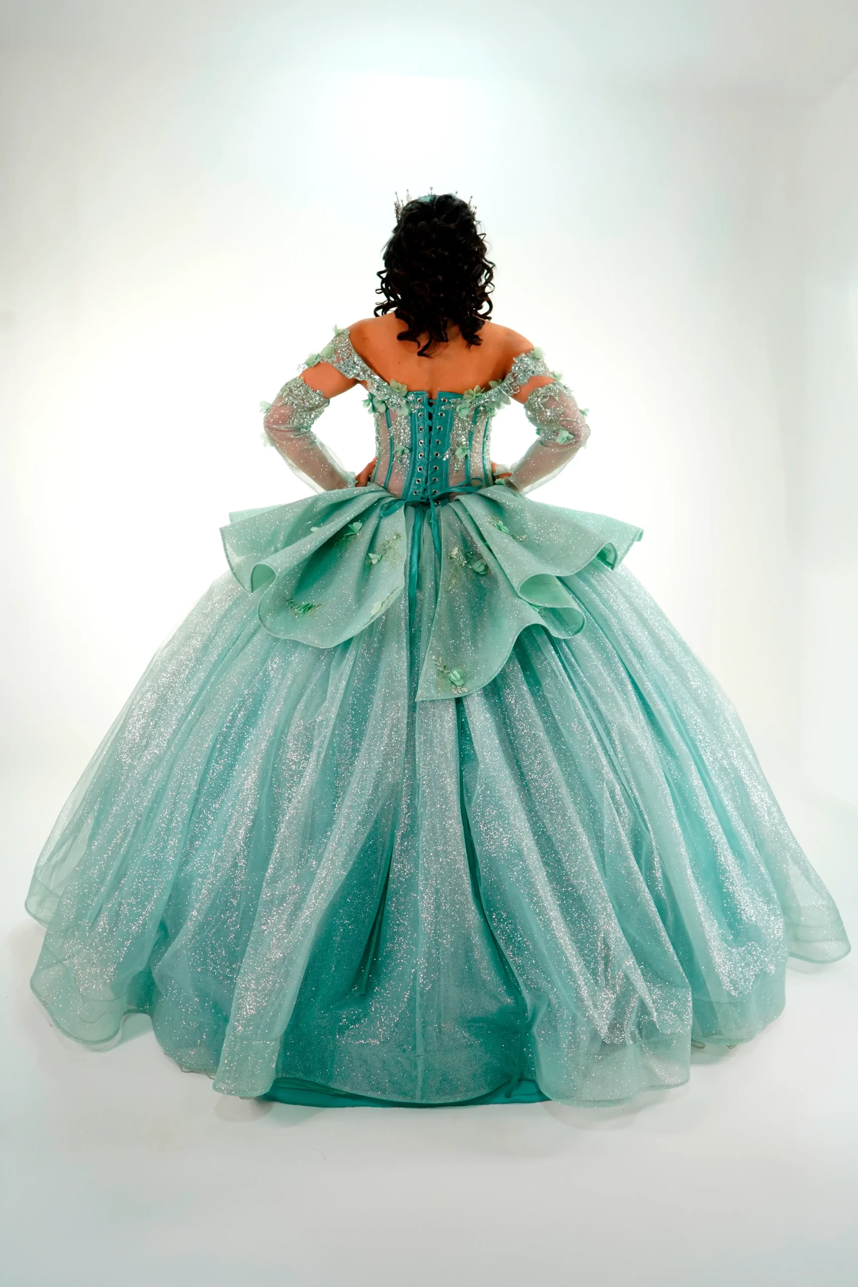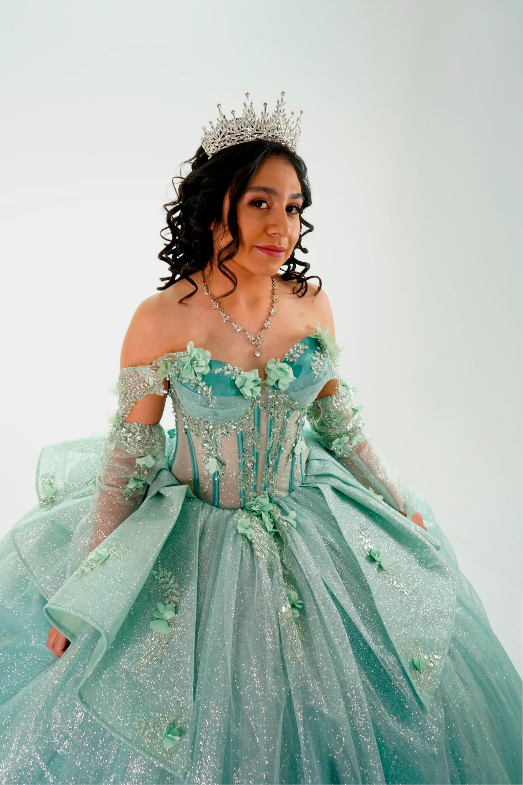Magnífico vestido, corset en transparencia con escote elaborado en fino tul brillante, con aplicación 3d con flores, el modelo cuenta con manga caida y manga larga desmontable en combinacion, falda de tul glitter, decorada con aplicaciones esparcidas por la falda,acompañada de faldon en costados de tul brillante con aplicaciones.