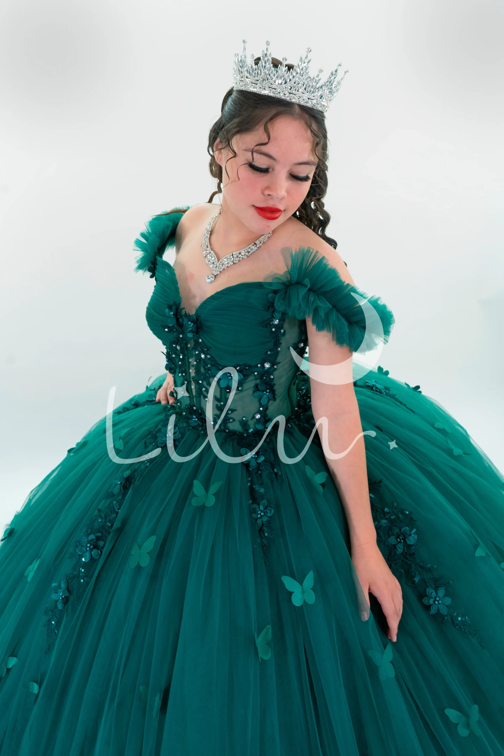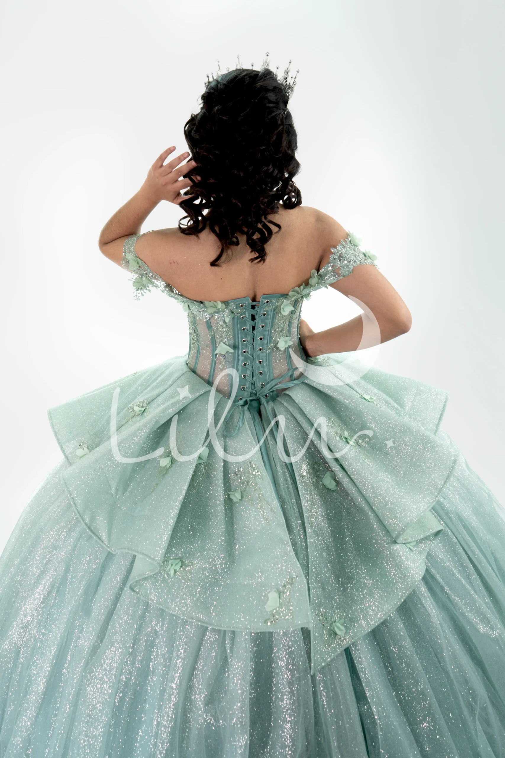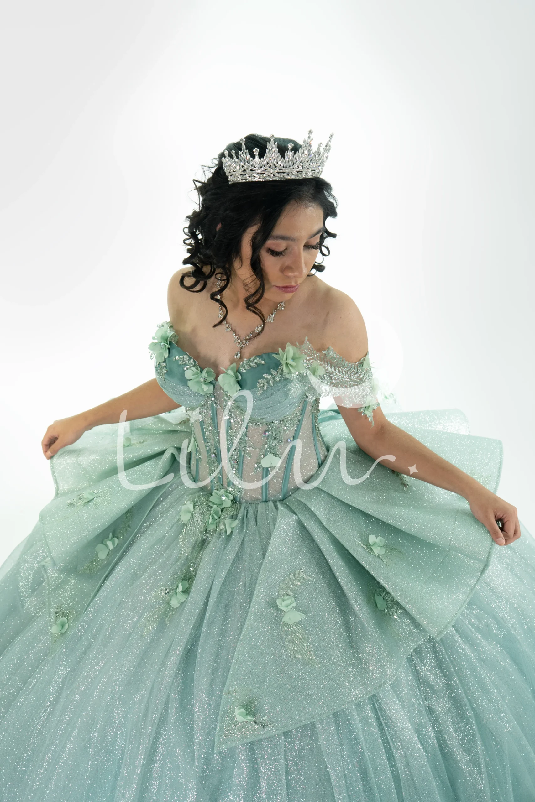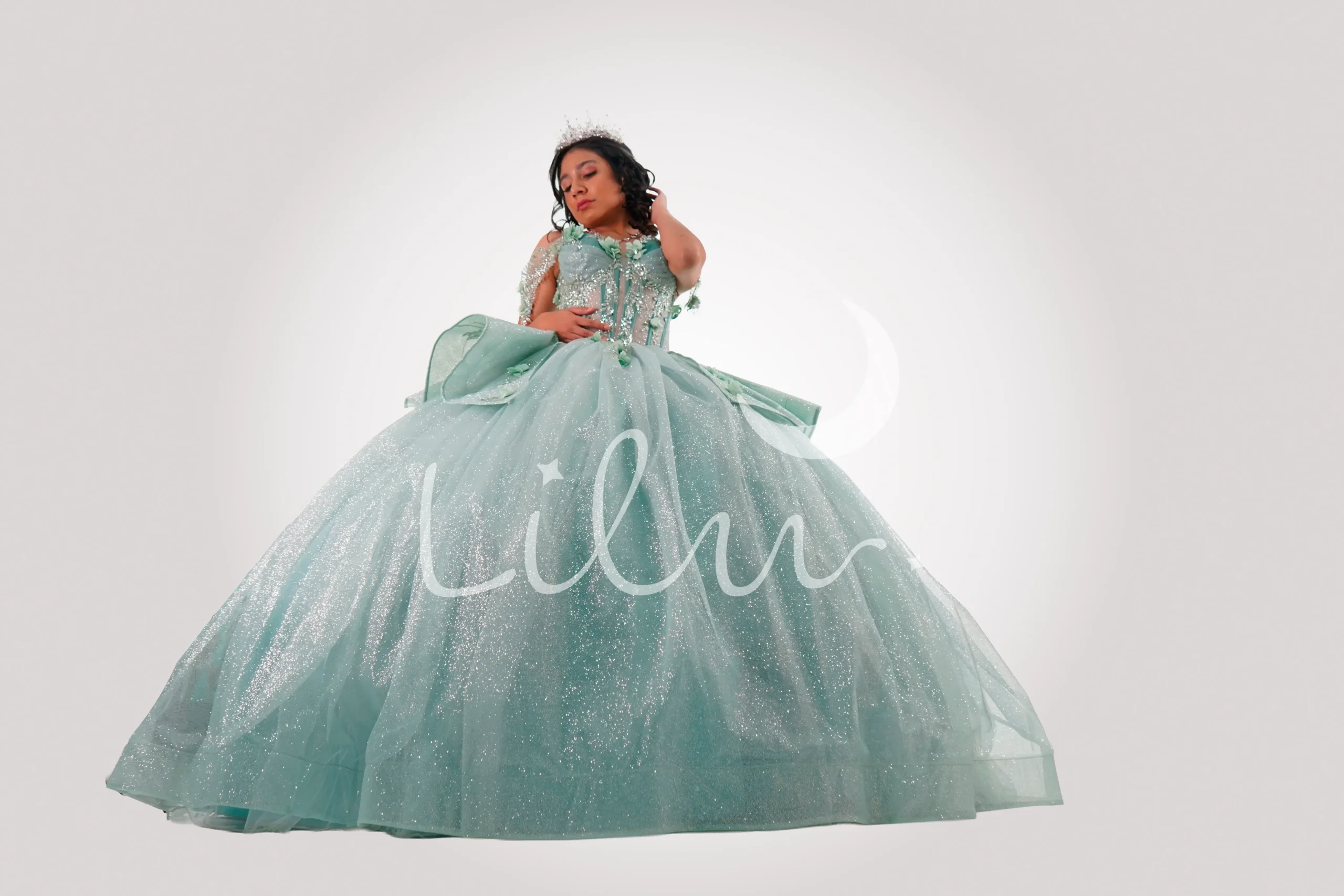 Magnífico vestido, corset en transparencia con escote elaborado en fino tul brillante, con aplicación 3d con flores, el modelo cuenta con manga caida y manga larga desmontable en combinacion, falda de tul glitter, decorada con aplicaciones esparcidas por la falda,acompañada de faldon en costados de tul brillante con aplicaciones.