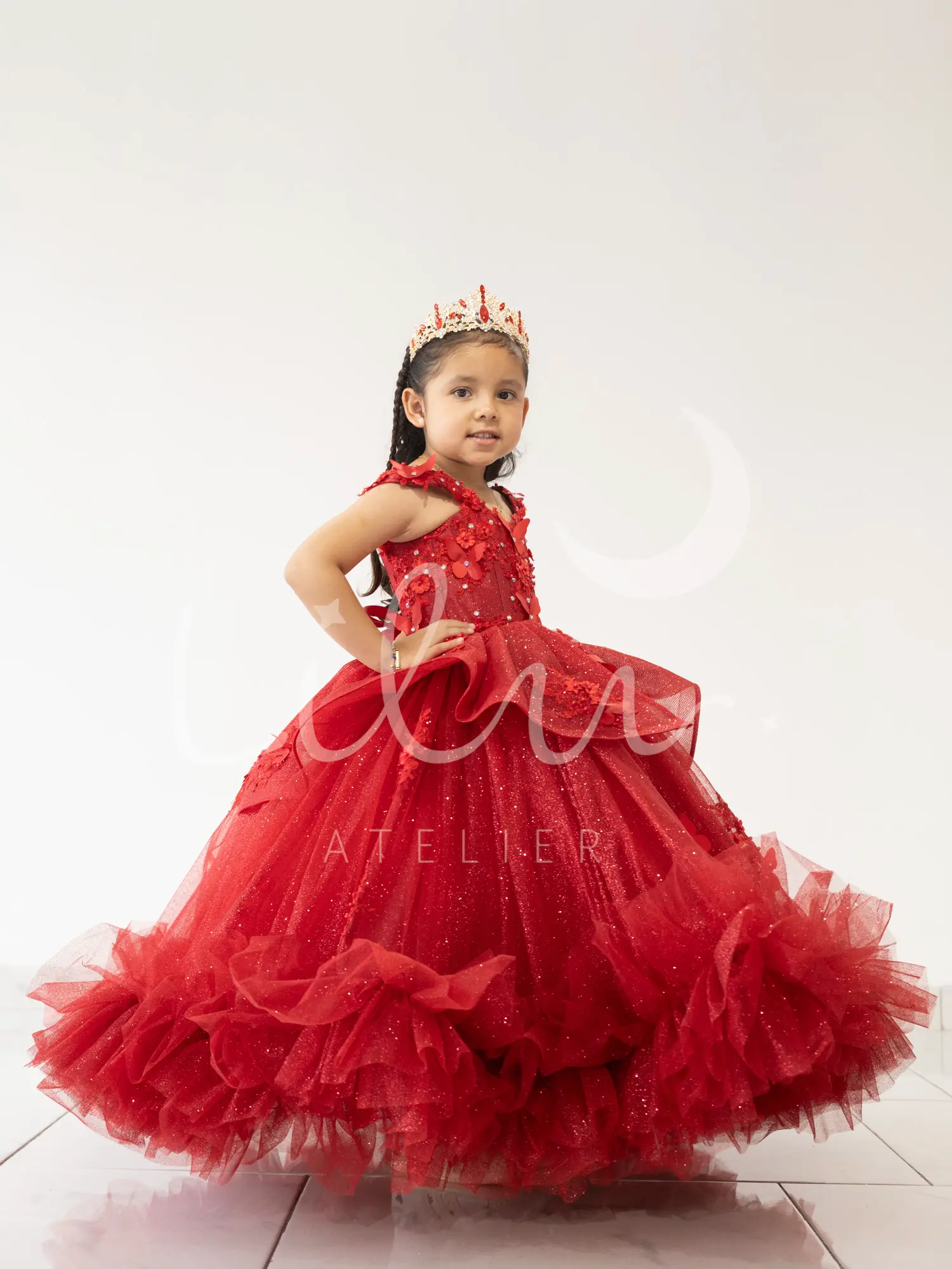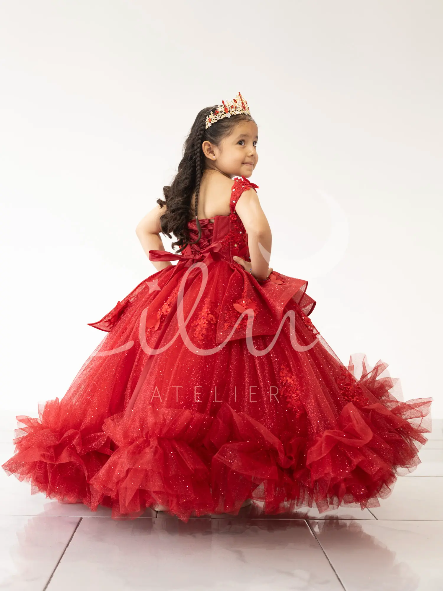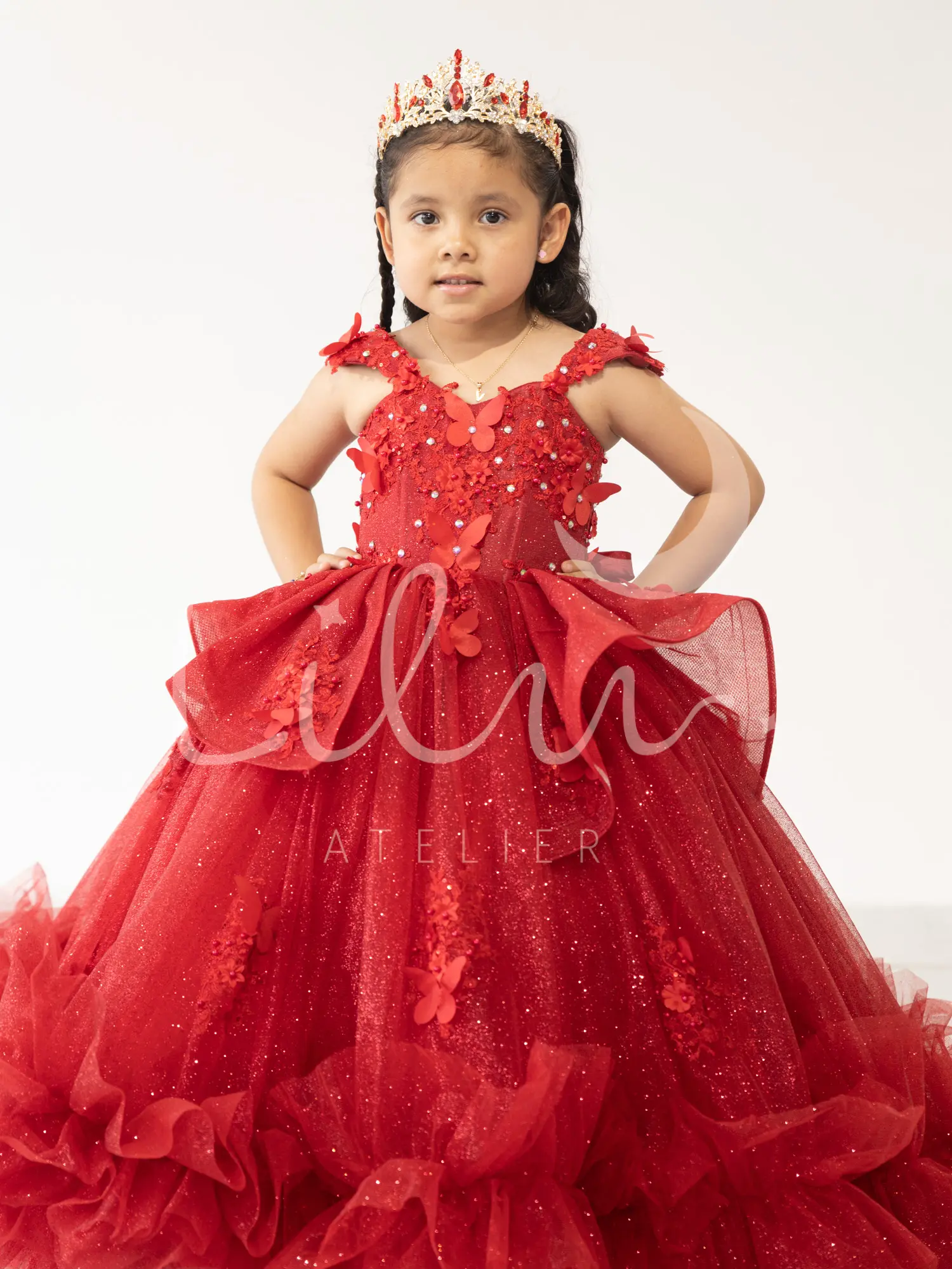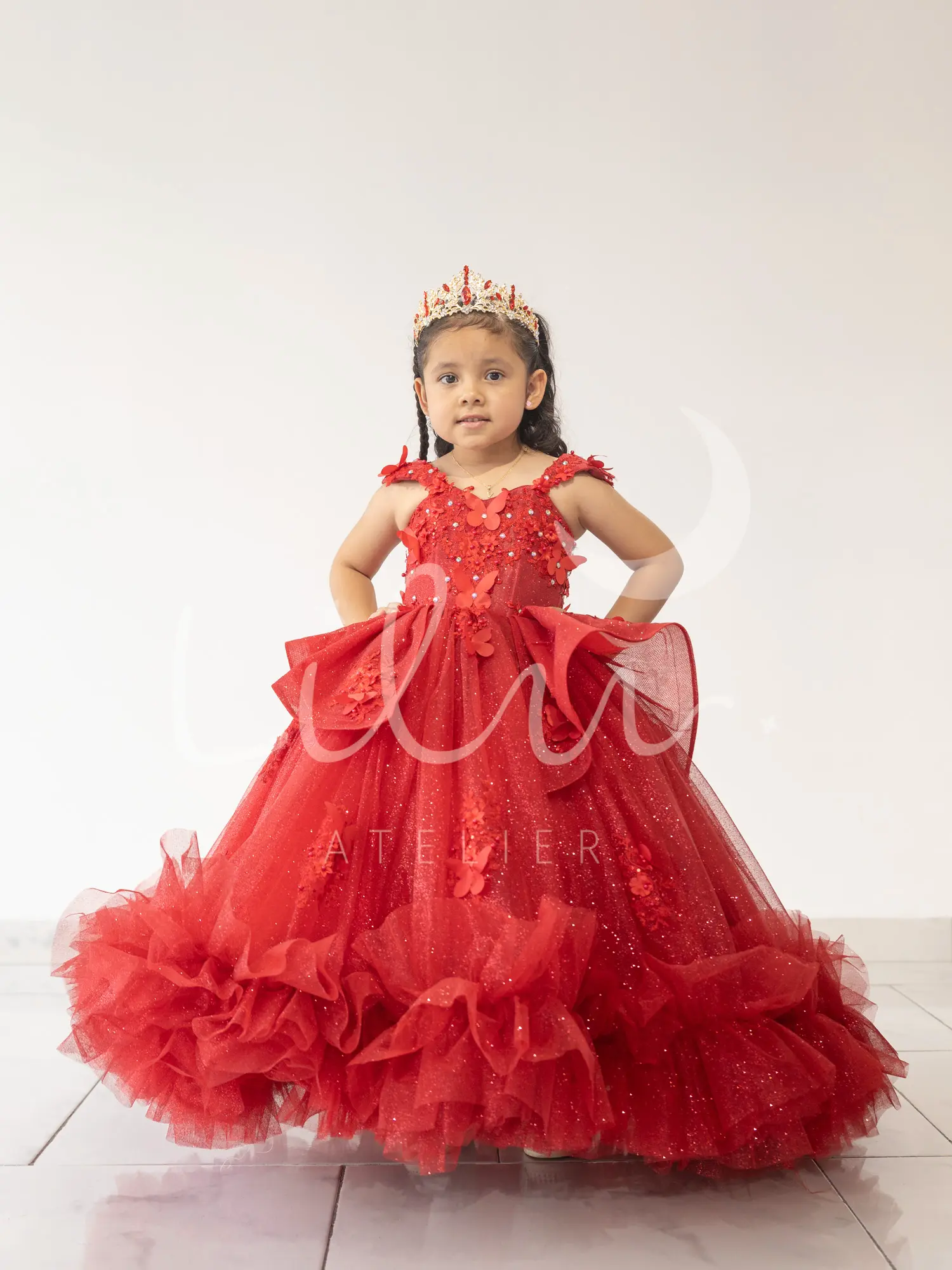 Elegante vestido de presentación, talle corte corazón elaborado en naomi y tul brilloso, decorado con aplicación con flores y mariposas en 3d, falda con pompón, acompañada de faldón en costados, elaborado de en tul brilloso y decorado con aplicaciones.