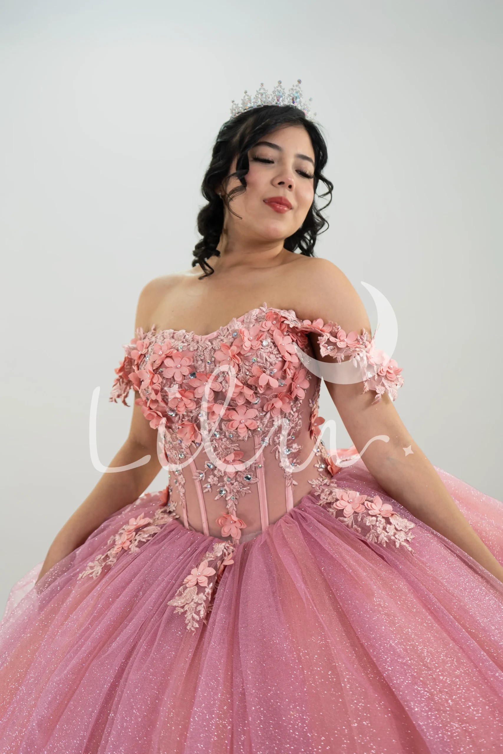 Sorprendente vestido de xv años, talle transparente, elaborado en tul brillante, decorado con aplicación fina de flores 3d y mariposas con pedrería, manga larga desmontable con aplicación, falda con hermosa elaborada en tu brillante con fina aplicación, acompañada de un doble en la parte trasera de la falda.