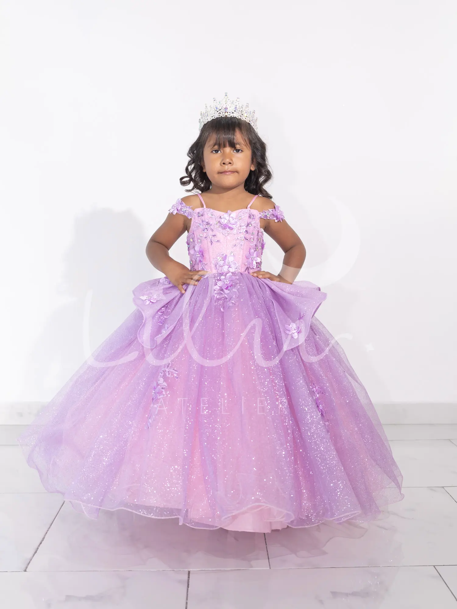 Encantador vestido de presentación, talle elaborado en naomi y glitter, decorado con aplicación con flores en 3d y pedrería, falda acompañada de faldón elaborada en tul brillante con aplicación.