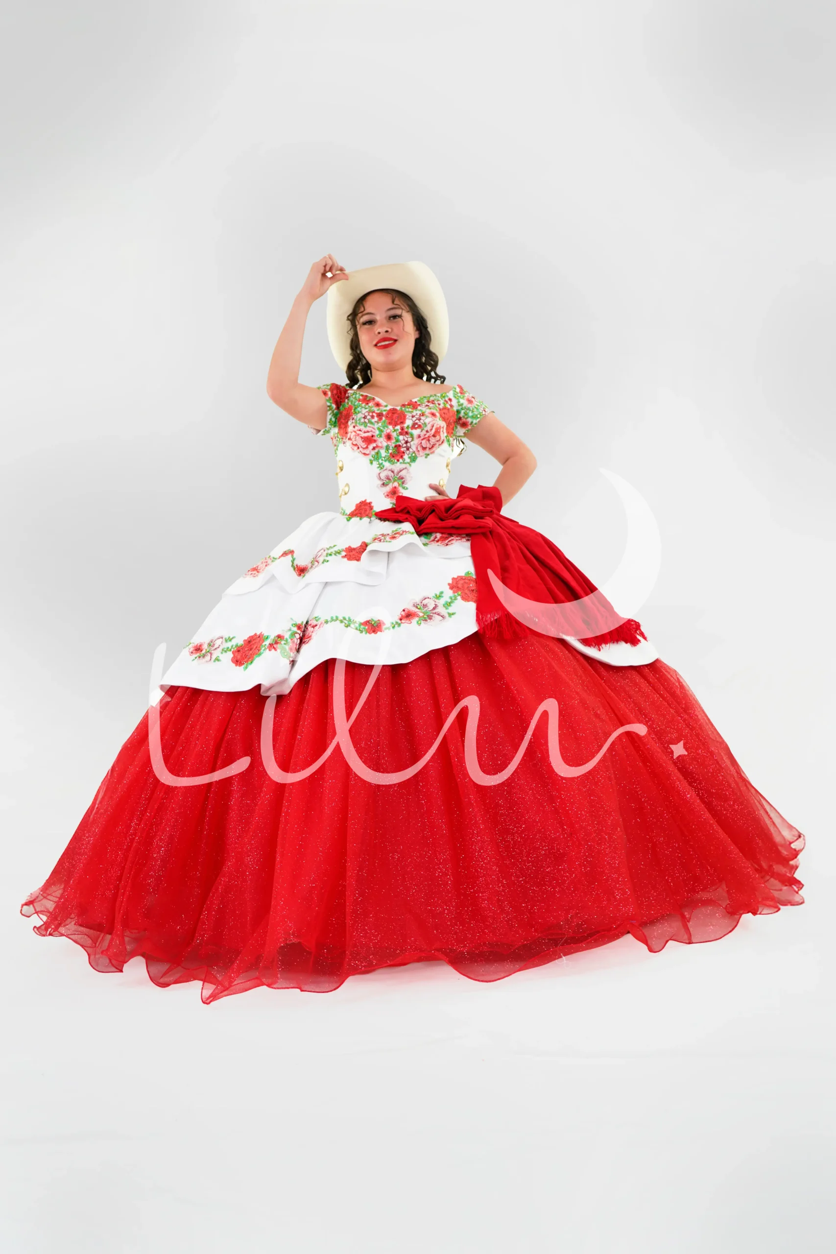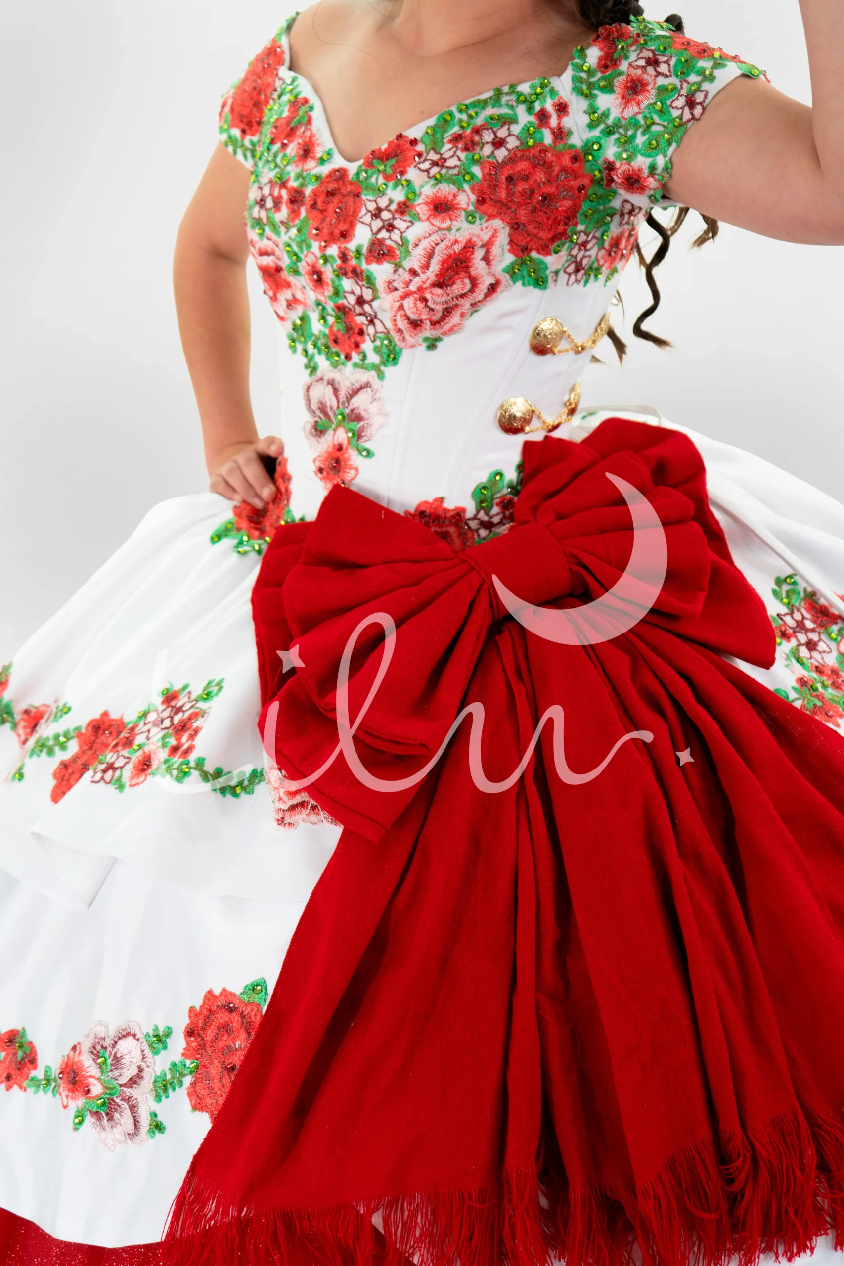 Elegante vestido de charro, talle elaborado en corte corazón con aplicación bordada, diseñado en fino razo, decorado con pedrería y botones en costados, falda elaborada de tul de brillos acompañada de faldones bordados y moño de reboso doble.
