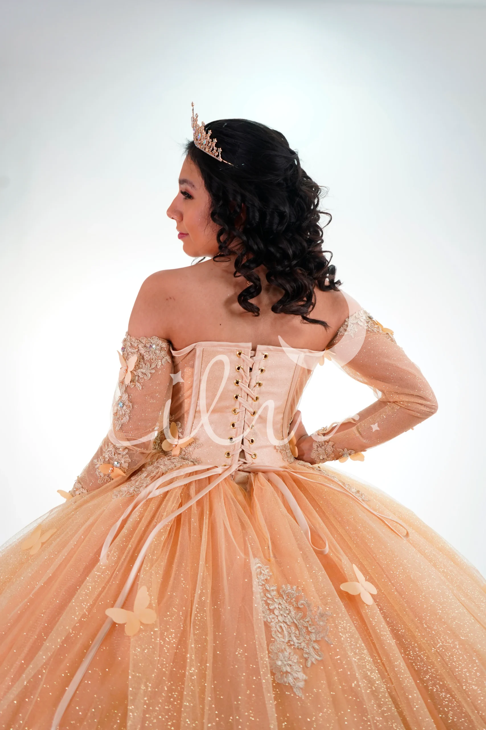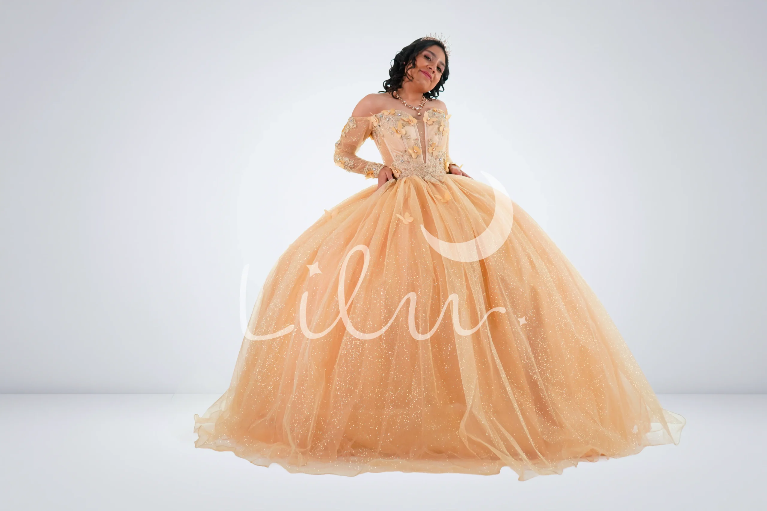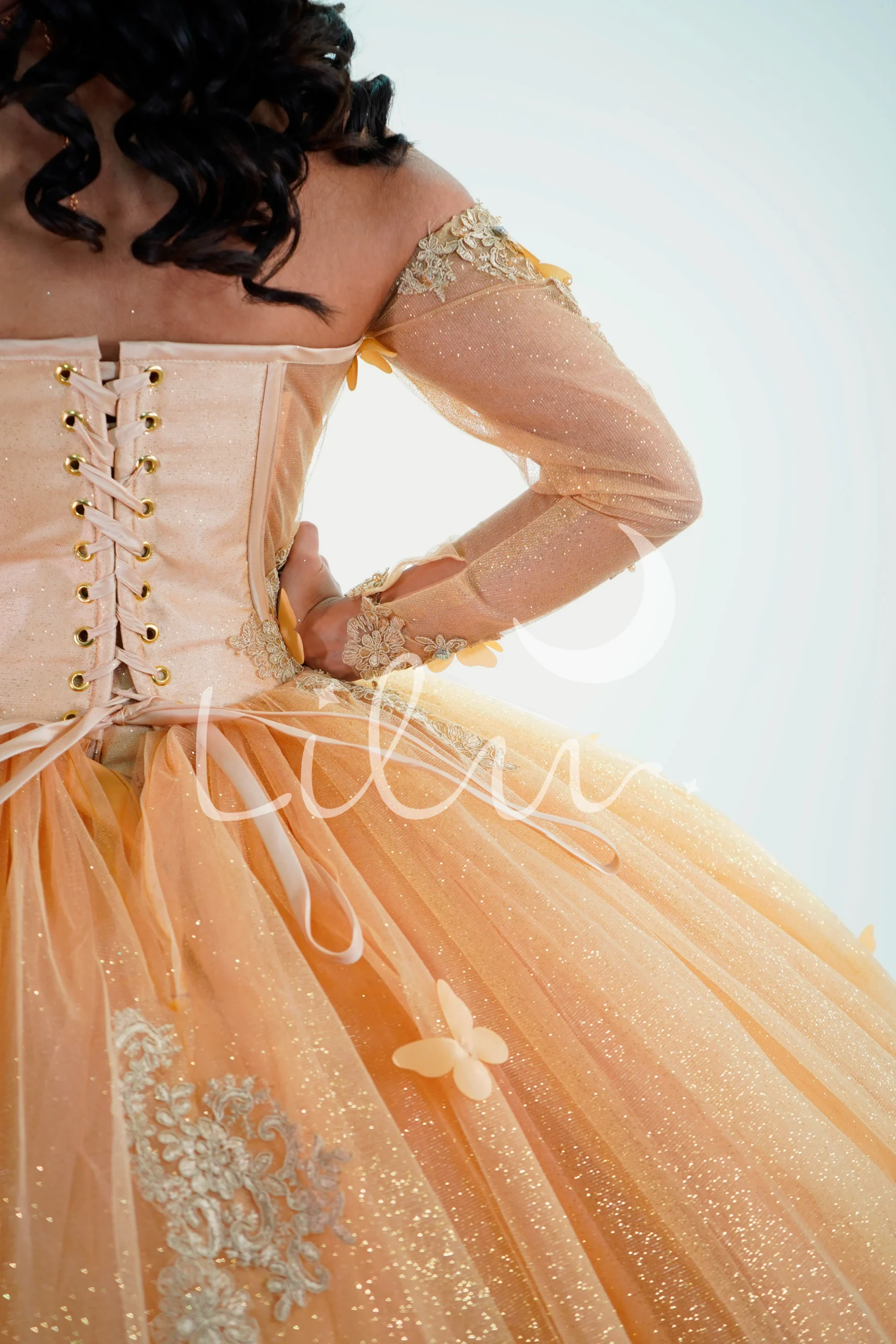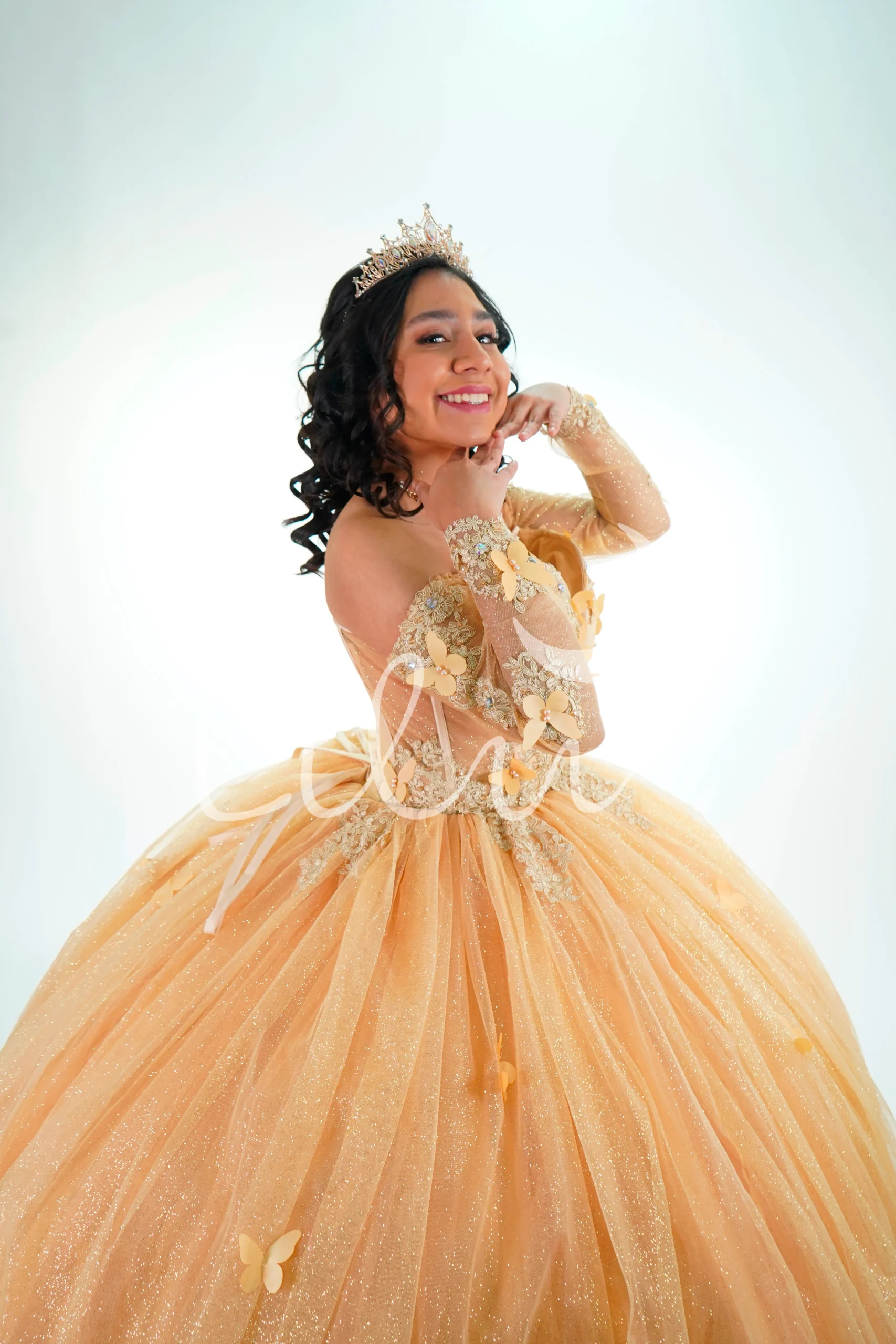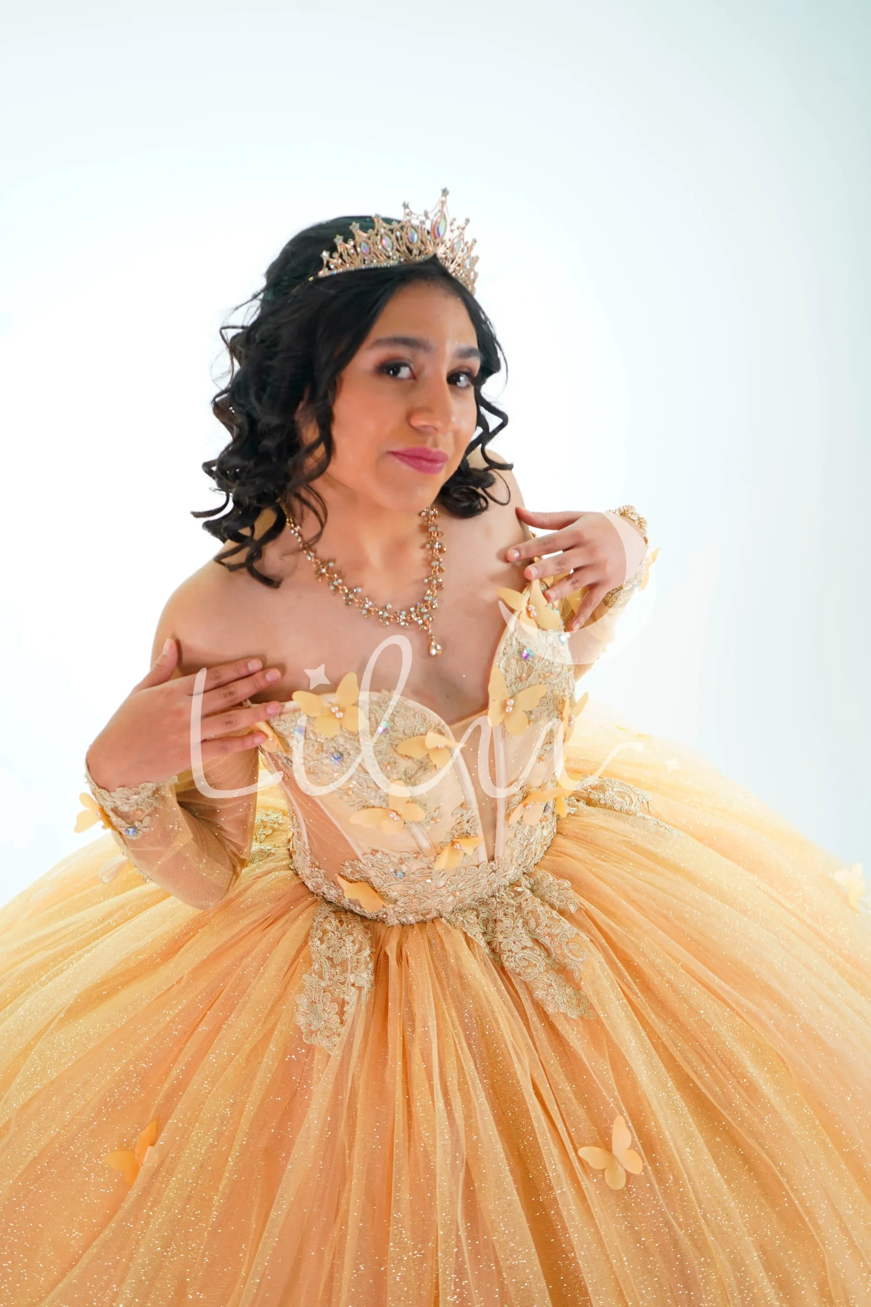 Deslumbrante vestido, talle en combinación de transparencia y revestido de naomi, con aplicación dorada, acompañada por mariposas con perlas en 3d y cristales cortados, falda con coleta, elaborada en fino tul gliter.